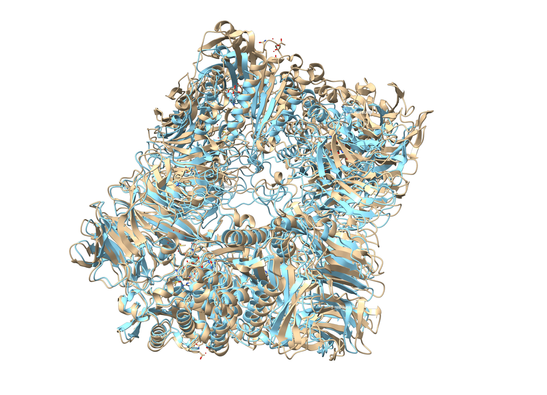 Ground truth (yellow) vs. AI prediction (blue) for a 2,624-residue protein complex, generated in a single pass across 64 GPUs. Credit: Fold-CP paper, Earendil Labs