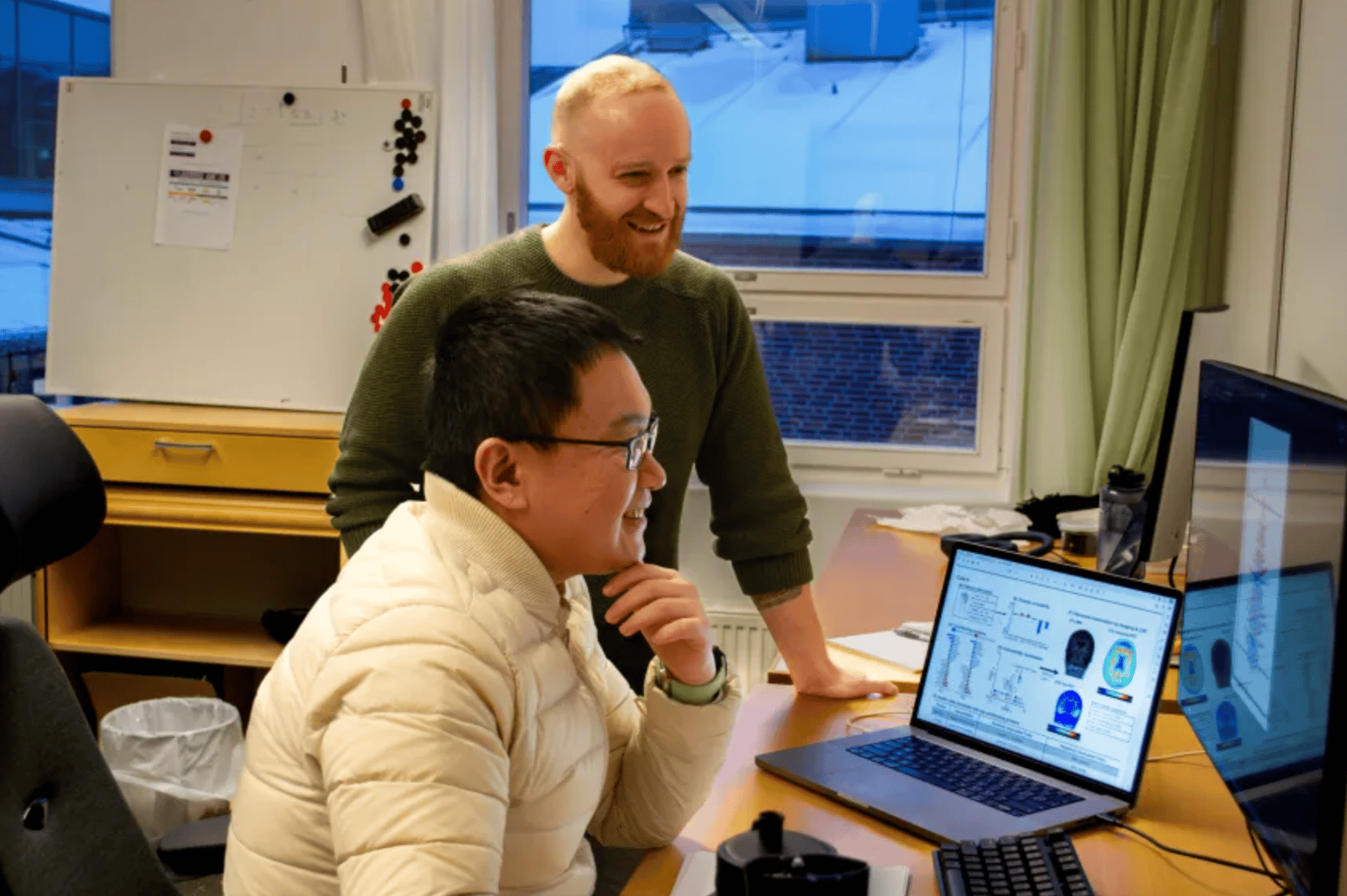 Two of the researchers behind the AI model, Jacob Vogel and Lijun An, show the results of their study. Credit: Emma Nyberg/Lund University.