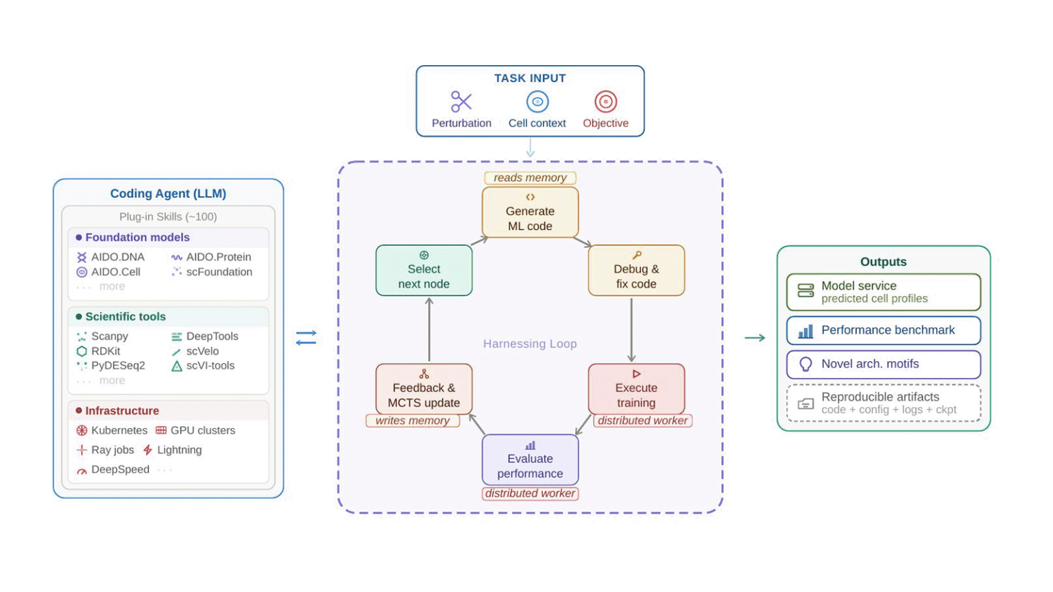 Give it a dataset and a task - say, predicting which genes change expression after a gene is silenced with CRISPR. An AI coding agent writes and debugs candidate models, drawing on a library of biological foundation models. A search algorithm decides which designs to refine and which to discard. The loop runs autonomously, evaluating hundreds of candidate architectures in days. Across four cell lines, VCHarness outperformed every expert-designed baseline.